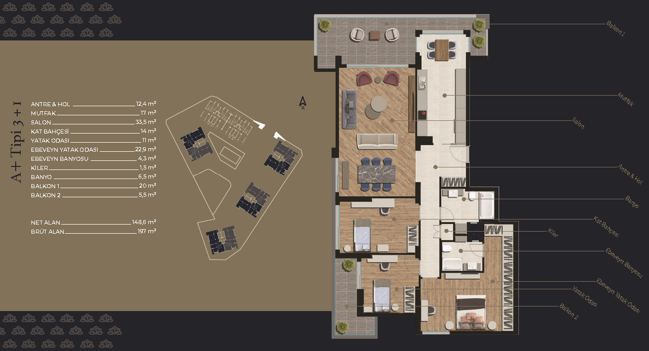 ONAG kalitesiyle inşa edilen 183, 189 ve 197 metrekarelik geniş ve ferah dairelerimiz tam da size göre tasarlandı. Tamamı havuz, park veya peyzaj manzaralı olan dairelerimizde konforlu bir hayat sizleri bekliyor. Dayanıklı ve lüks malzemelerin kullanıldığı, deprem yönetmenliğine uygun, 7/24 güvenlikli sitemizde aileniz ve çocuklarınızla birlikte düşlediğiniz yaşamı bulacaksınız.