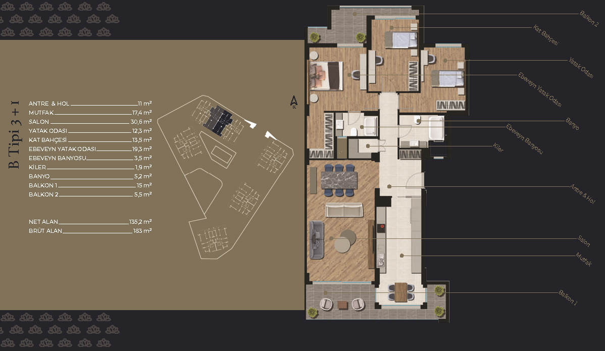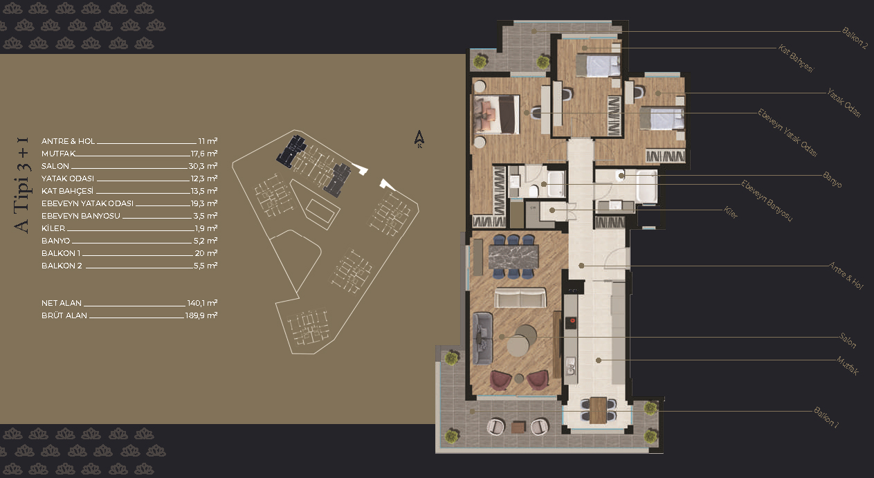 ONAG kalitesiyle inşa edilen 183, 189 ve 197 metrekarelik geniş ve ferah dairelerimiz tam da size göre tasarlandı. Tamamı havuz, park veya peyzaj manzaralı olan dairelerimizde konforlu bir hayat sizleri bekliyor. Dayanıklı ve lüks malzemelerin kullanıldığı, deprem yönetmenliğine uygun, 7/24 güvenlikli sitemizde aileniz ve çocuklarınızla birlikte düşlediğiniz yaşamı bulacaksınız.