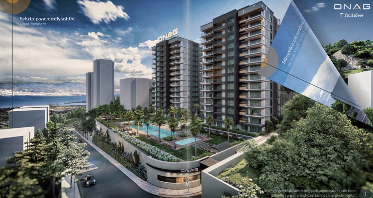 Güvenlikli, konforlu, özel kapalı otoparka sahip günün yorgunluğunu ve stresini atacağınız, kendinizi iyi hissettirecek spor salonu, eğlence odası, çocuk oyun alanı, havuz, sauna, yürüyüş yolu, özel peyzaj düzenlemeleri gibi sosyal donatıları olan ve güzel İzmir'imizin doğa ve deniz manzarasını sunan projemiz Narlıdere'de ONAG kalitesi ile yükseliyor.